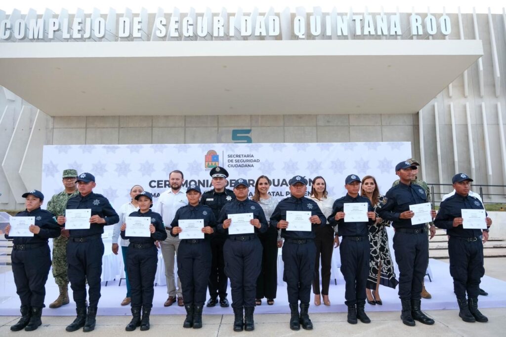 Cancún.- Autoridades del Gobierno de Quintana Roo encabezaron la ceremonia de graduación del Programa de Formación Inicial de la Policía Estatal Preventiva del que egresaron 43 elementos entre ellos 27 mujeres.